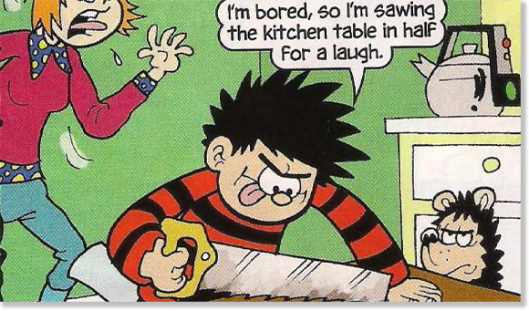 That’s Dennis the Menace. I know what you’re thinking: “Dennis the Menace is a well-meaning blonde child who causes trouble for Mr. Wilson through humorous misunderstandings, you beautiful genius.” Of course, you’re right. But we live in a world where miracles are real. The two Dennises were independently launched five days apart in 1951. And whereas the American version represents a nation’s automythological understanding of itself as a kind-hearted, if sometimes blundering force for good, Britain made Dennis into an avatar of its collective id. Dennis the Menace is a card-carrying member of the Anti-Object Task Force who enacts destruction simply because he can.
